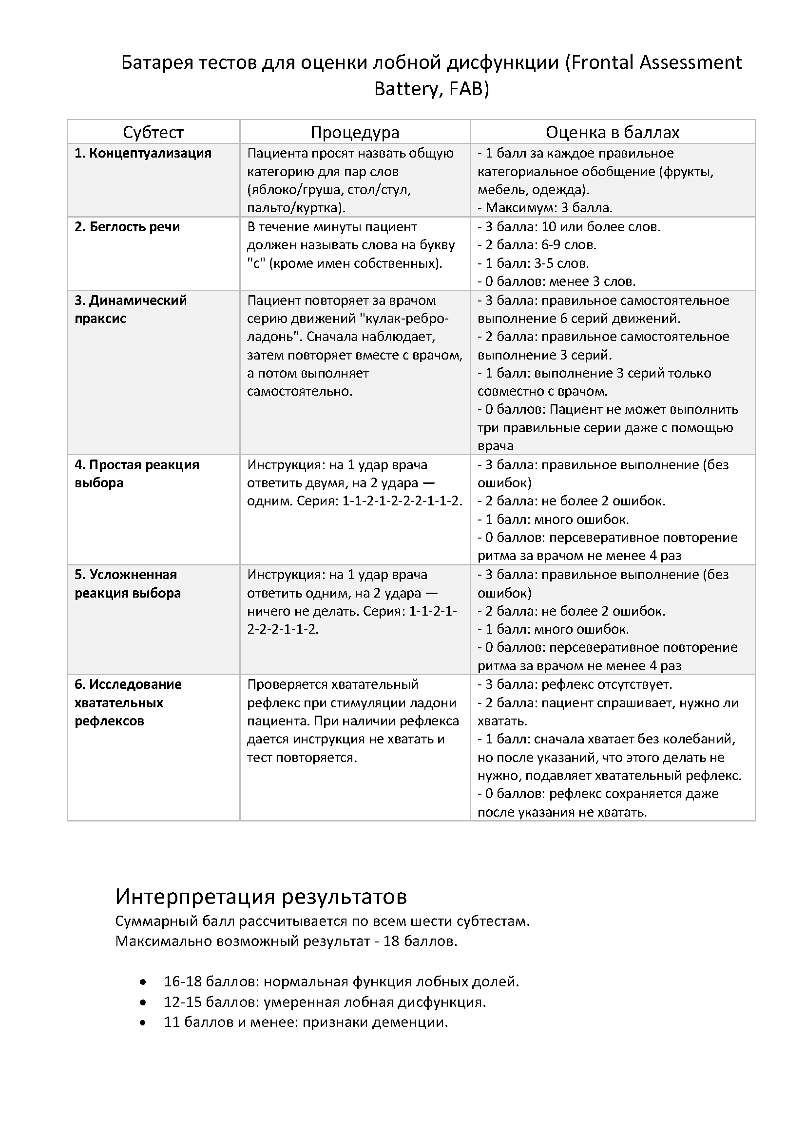 Суммарный балл по всем субтестам позволяет оценить степень лобной дисфункции. Общепринятая трактовка результатов следующая :