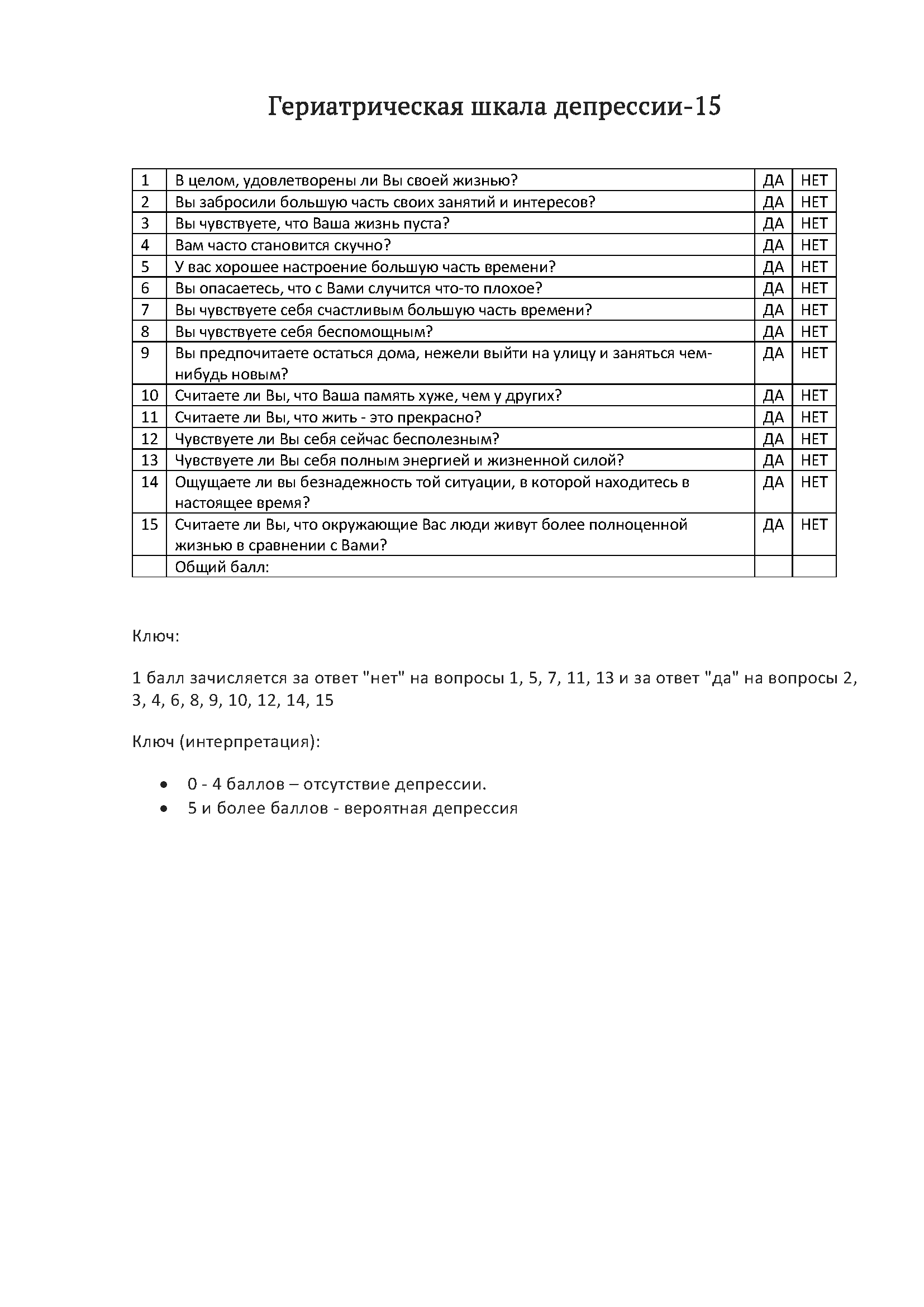 Таким образом, GDS является ценным и широко используемым инструментом для первичной оценки психоэмоционального состояния пожилых людей в гериатрической практике.