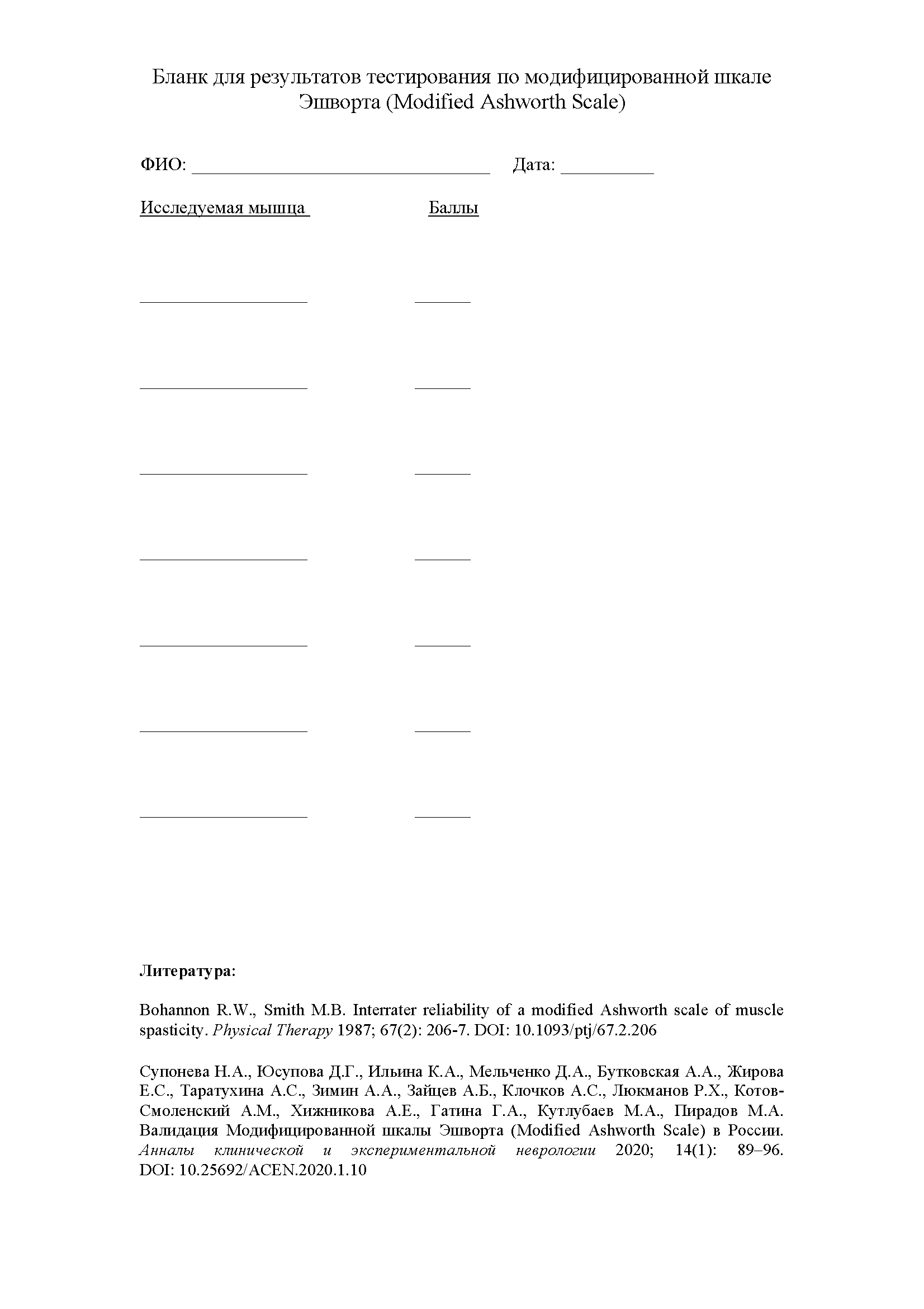 - Супонева Н.А., Юсупова Д.Г., Ильина К.А., Мельченко Д.А., Бутковская А.А., Жирова Е.С., Таратухина А.С., Зимин А.А., Зайцев А.Б., Клочков А.С., Люкманов Р.Х., КотовСмоленский А.М., Хижникова А.Е., Гатина Г.А., Кутлубаев М.А., Пирадов М.А. Валидация Модифицированной шкалы Эшворта (Modified Ashworth Scale) в России. Анналы клинической и экспериментальной неврологии 2020; 14(1): 89–96. DOI: 10.25692/ACEN.2020.1.10