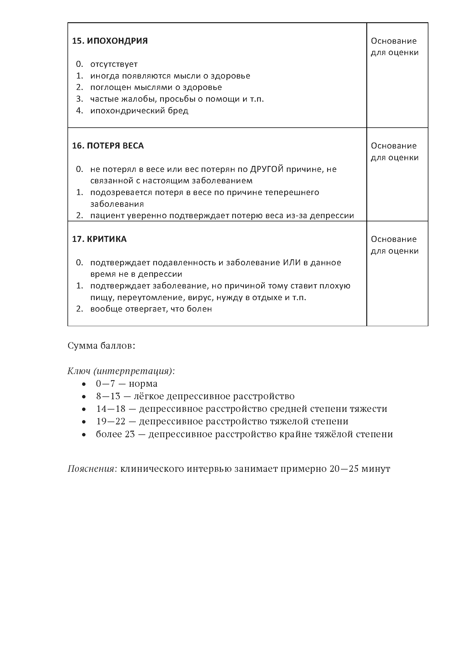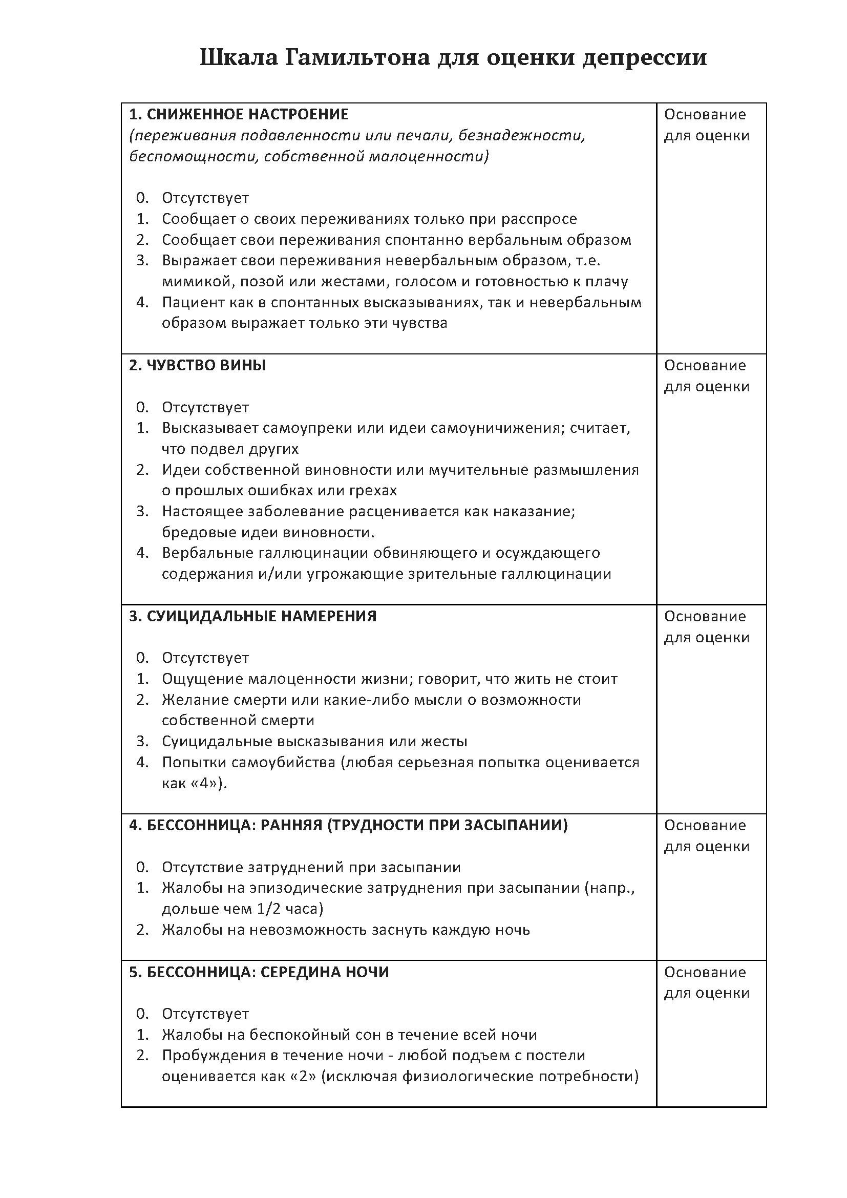 Шкала Гамильтона для оценки депрессии предназначена для количественной оценки состояния пациентов с депрессивными расстройствами до, во время и после лечения (наблюдения клинической динамики). Шкала заполняется врачом.