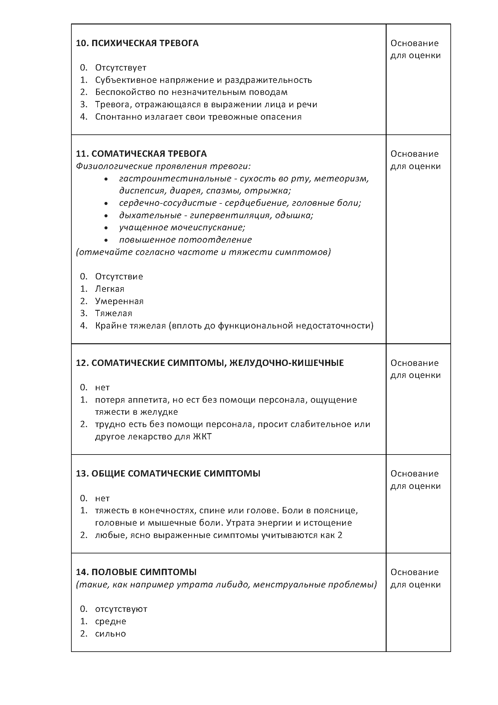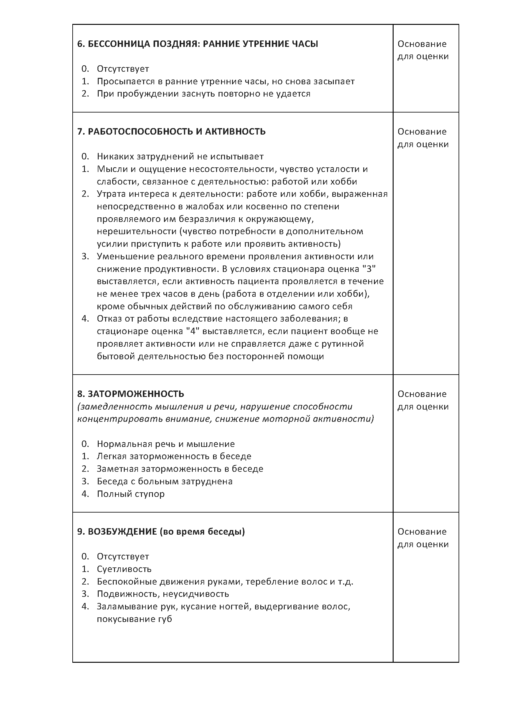 - Упоминаемым периодом для оценки является неделя, предшествующая опросу, за исключением пунктов 8, 9 (во время опроса) и 16 (перед эпизодом).