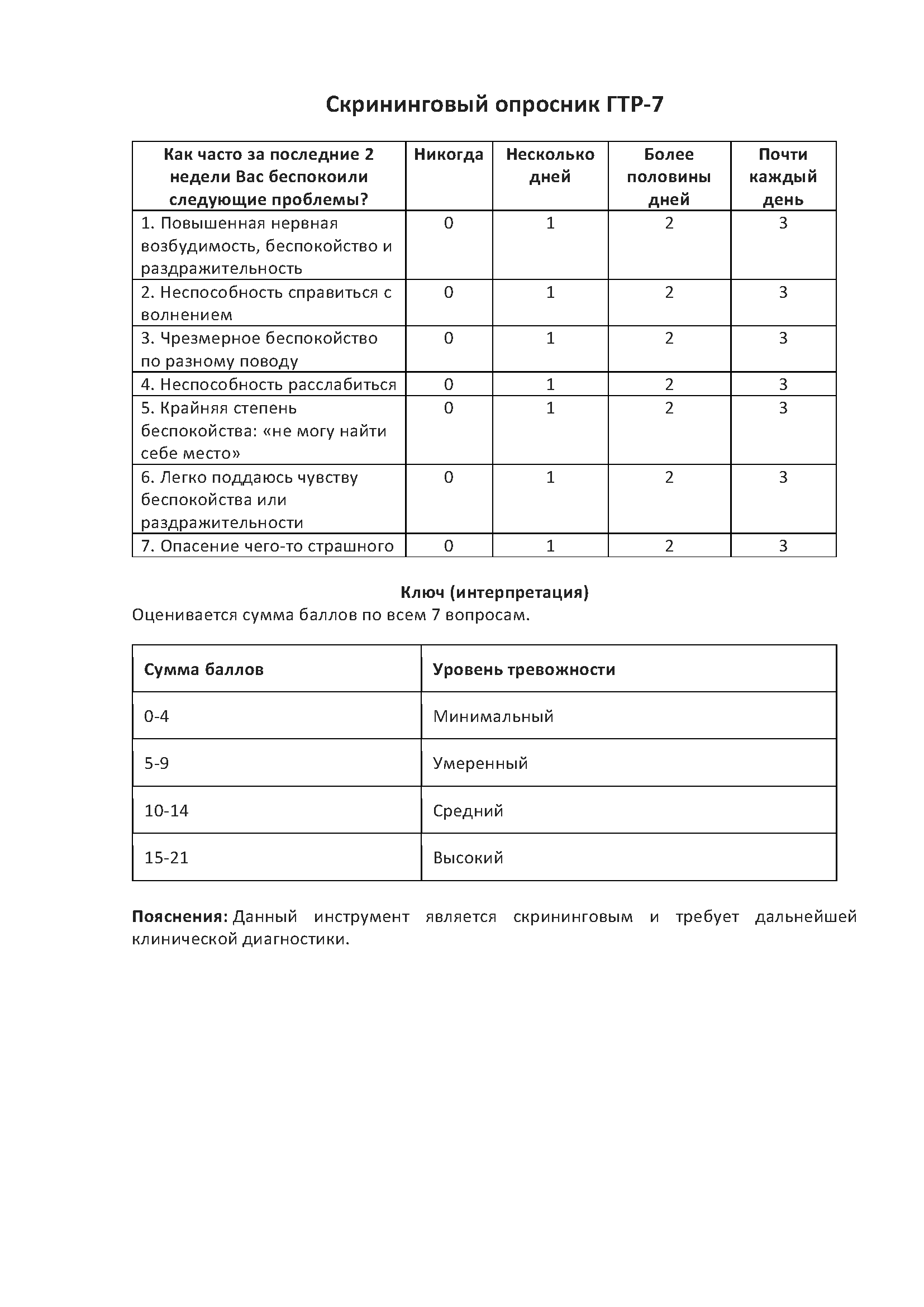 Опросник генерализованного тревожного расстройства, ГТР-7 (General Anxiety Disorder-7, GAD-7) - личностный опросник для оценки уровня тревожности и скрининга генерализированного тревожного расстройства(ГТР).